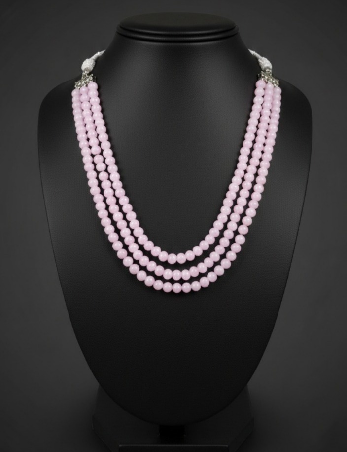 Delicate and effortlessly elegant, this Pink Onyx necklace by ORROVIA PVT LTD is designed to embody softness and grace. Crafted with smooth, polished pink onyx beads arranged in graceful layered strands, the necklace creates a refined silhouette that rests beautifully along the neckline. The gentle blush tone of the stones adds a subtle warmth, making the piece timeless and versatile.